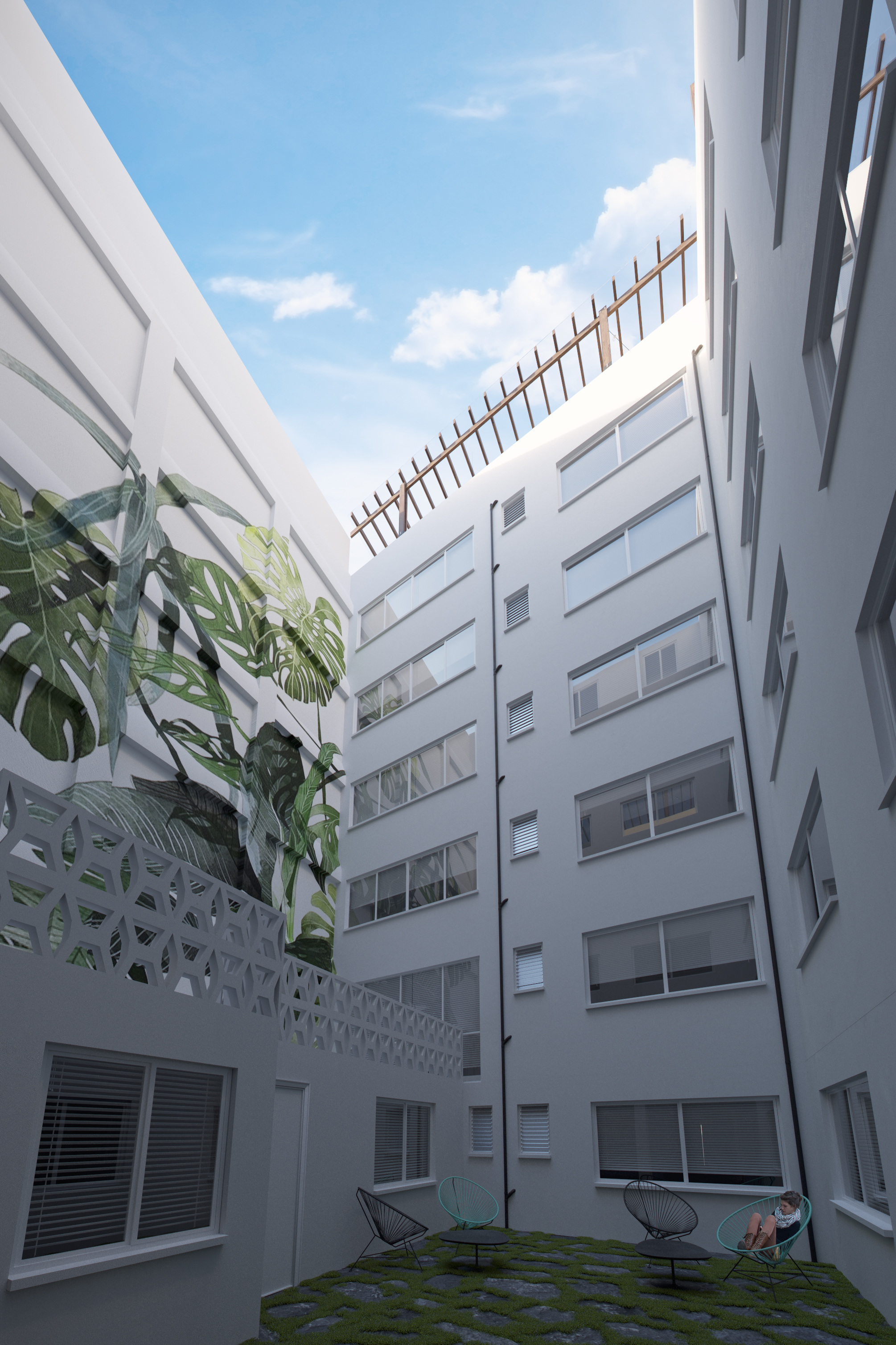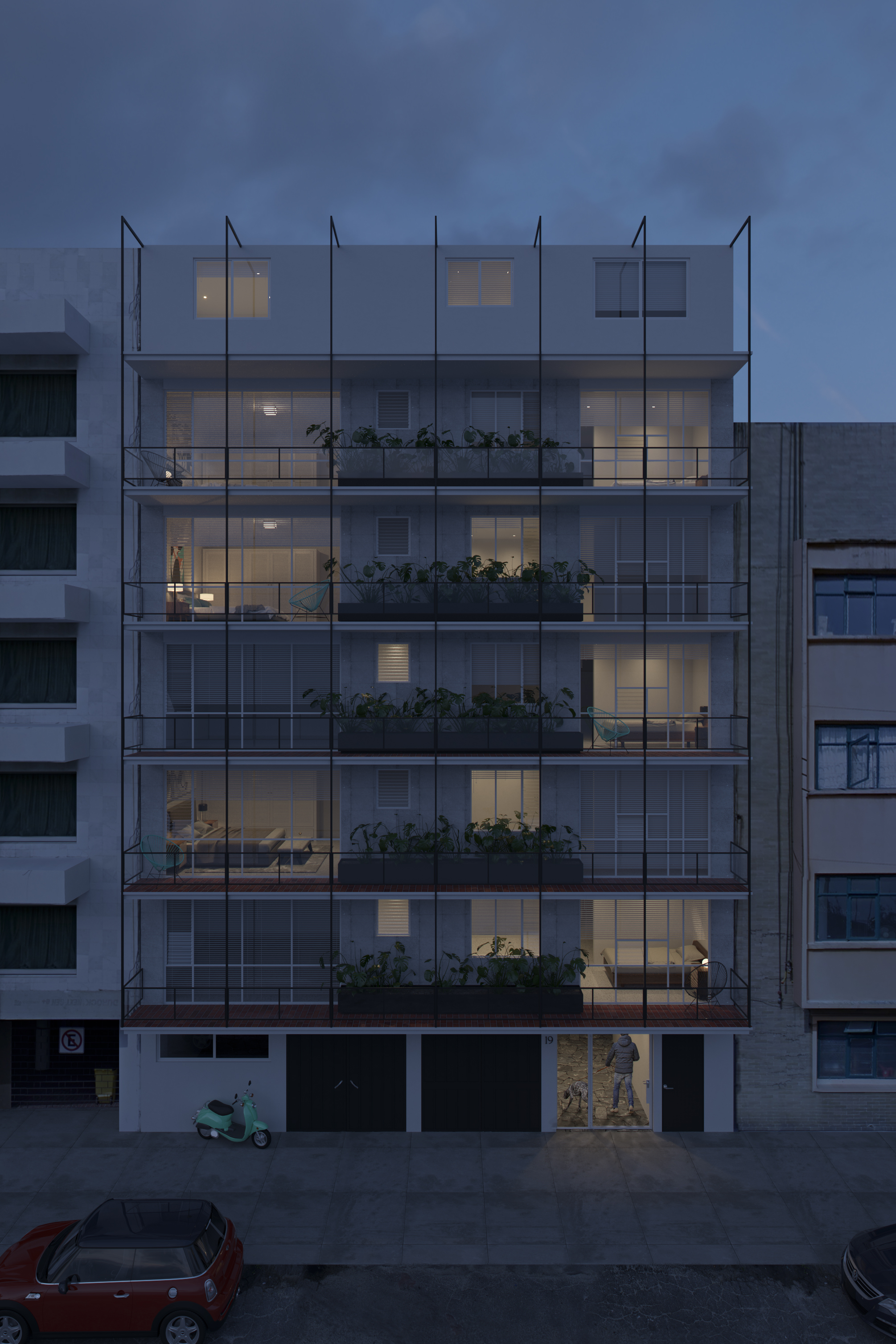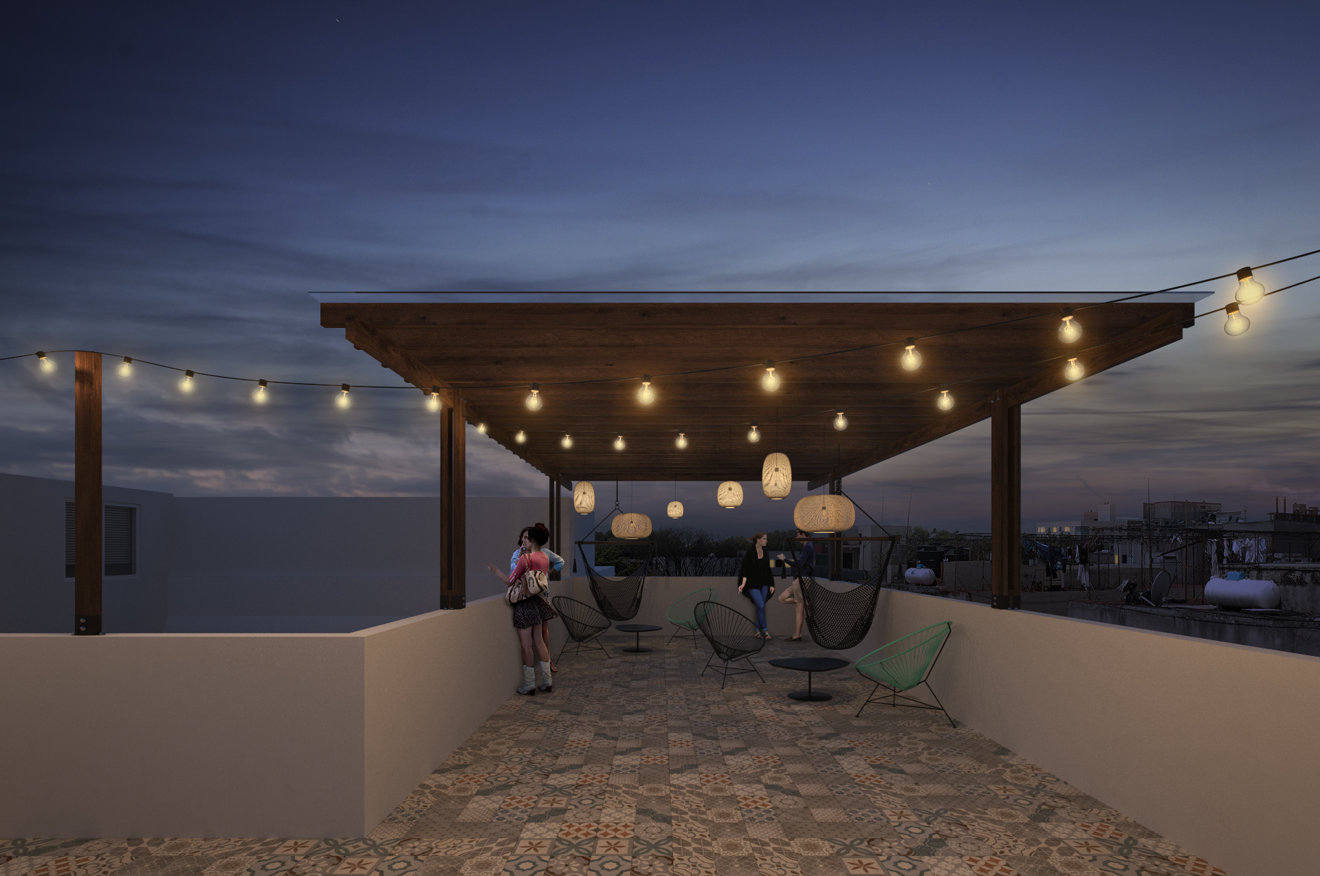 Edificio de 6 niveles con 19 departamentos de 50 a 75m2. Cuenta con Roof Garden común, patio central y terrazas privadas. Los departamentos tiene un diseño de interiores moderno con el encanto decorativo "retro"